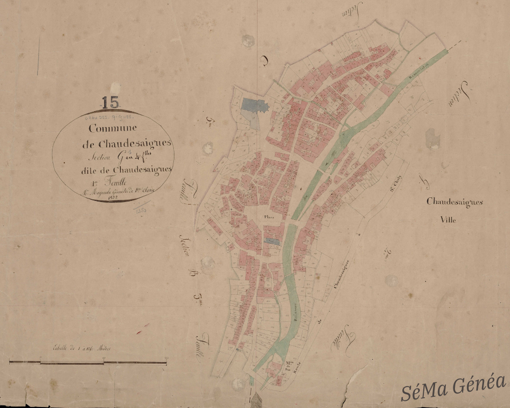 Voici le plan cadastral daté de 1832 de la commune de Chaudes-Aigues dans le Cantal sur lequel j’ai travaillé.