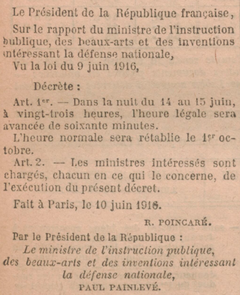 La loi est finalement adoptée le 9 juin 1916 : l’heure sera avancée de 60 minutes dans la nuit du 14 au 15 juin 1916 et sera rétblie le 1er octobre.